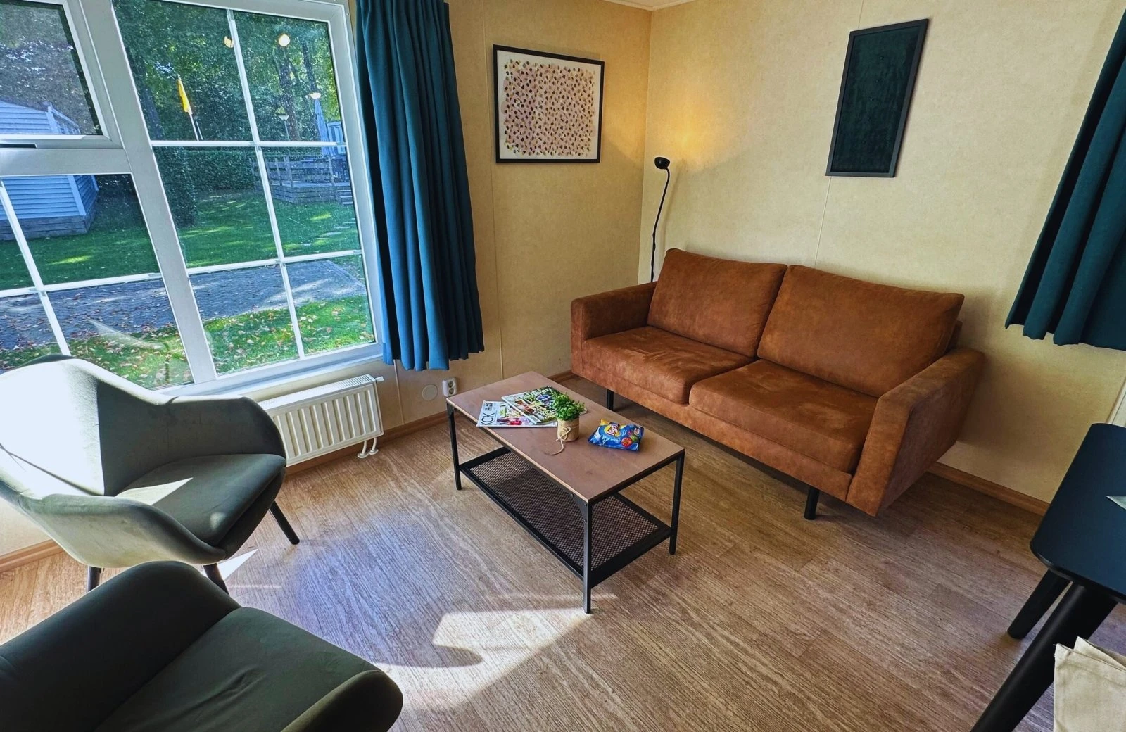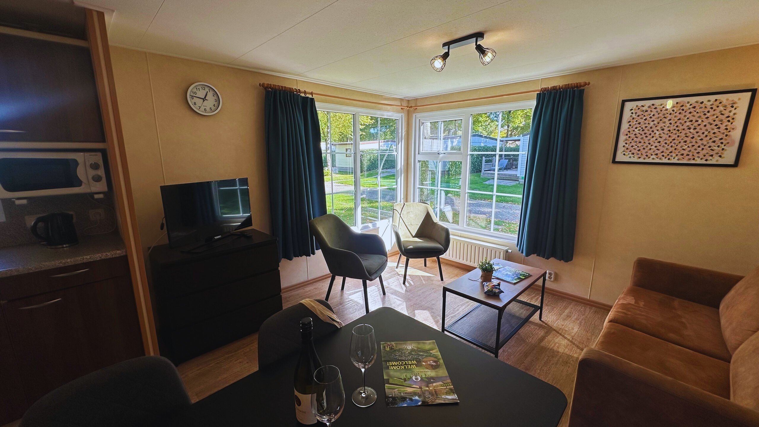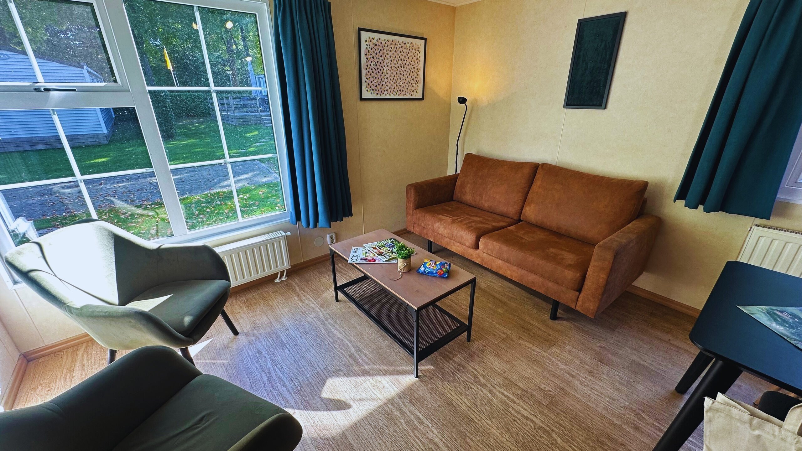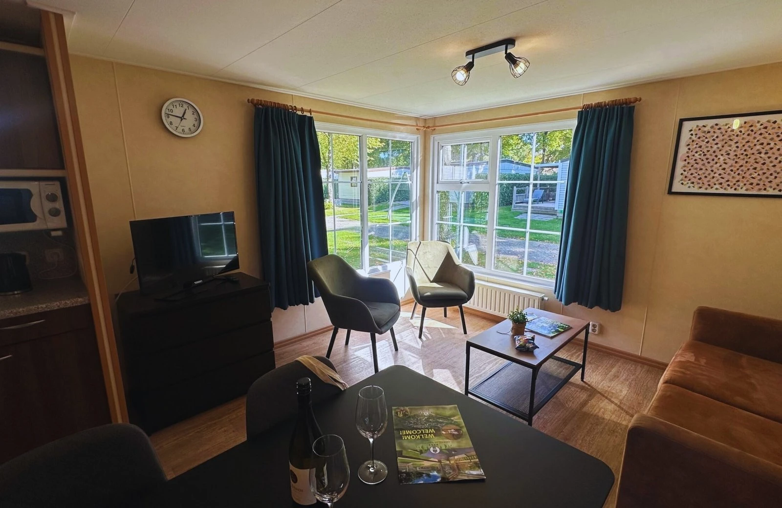Chalet Typ D für 4 Personen ist gemütlich und hat ein schönes Licht wegen der großen Fenster. Auf der großzügigen Terrasse können Sie die Sonne und den Blick ins Grüne genießen.