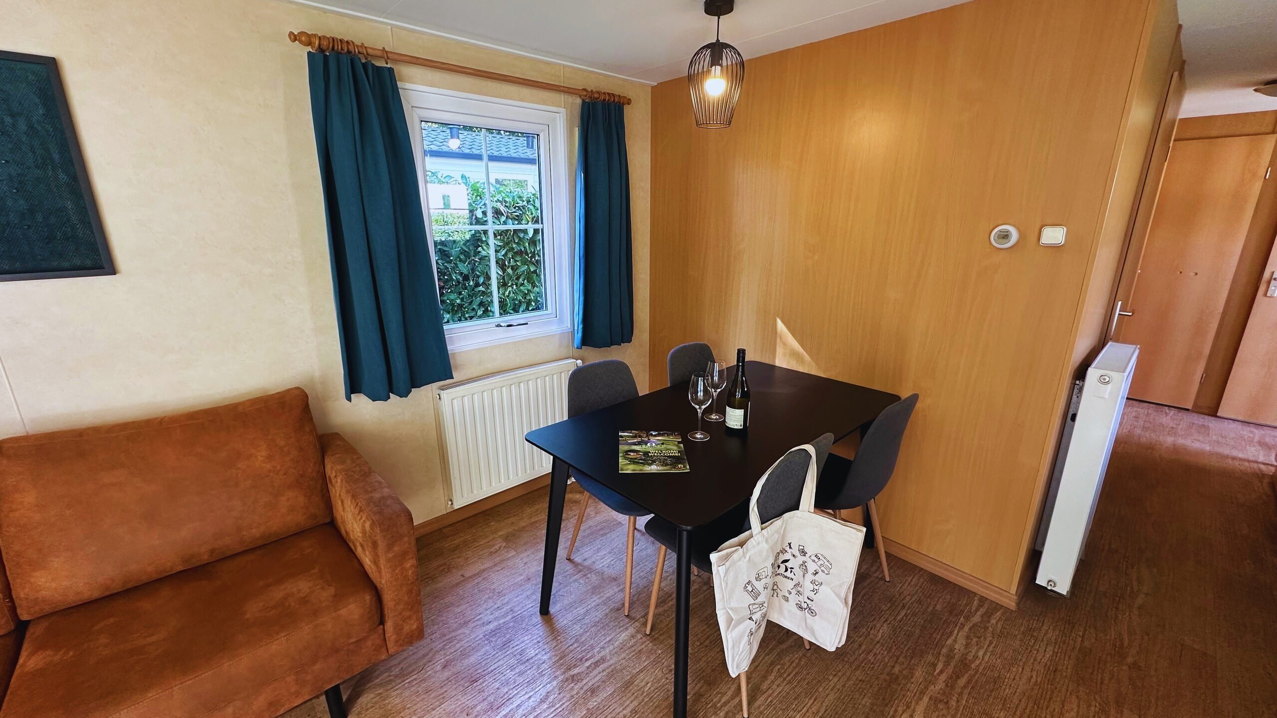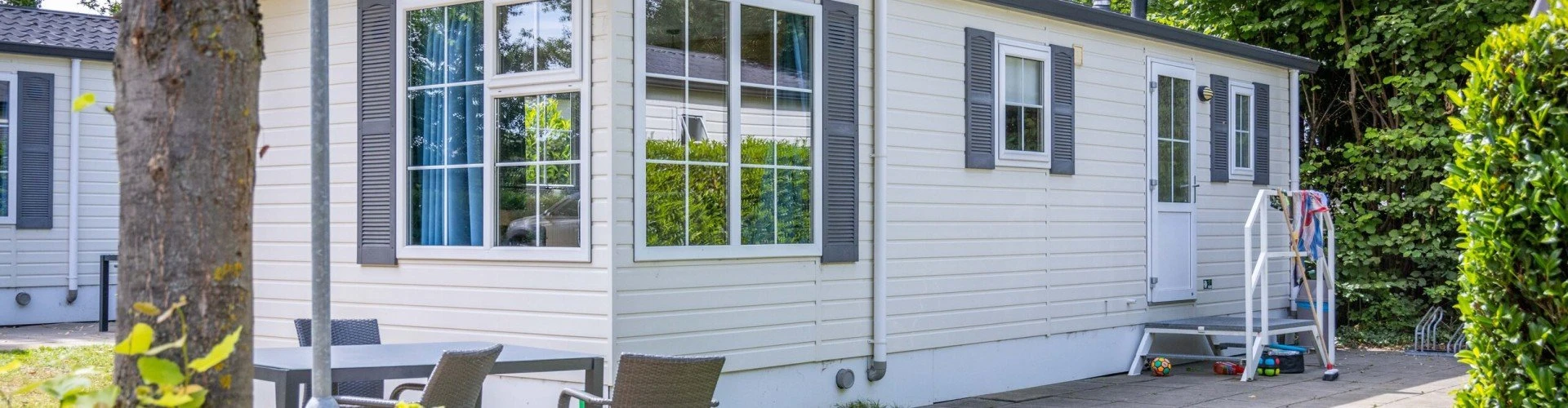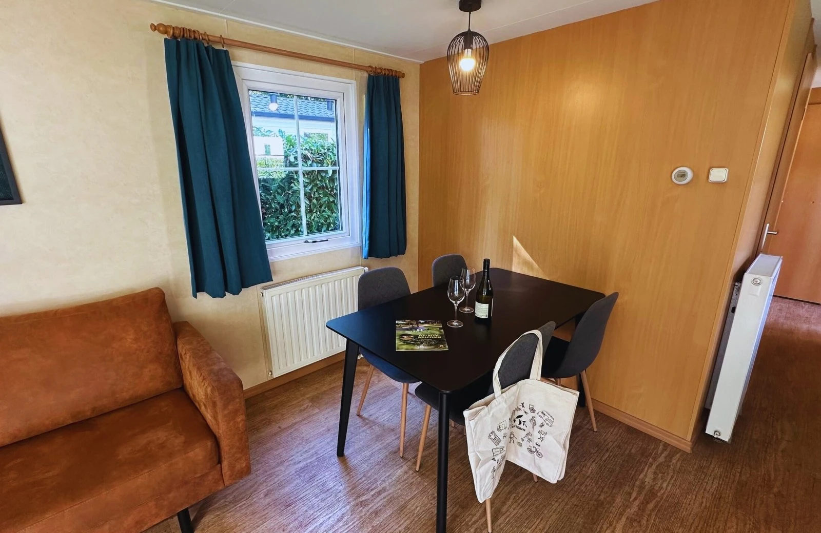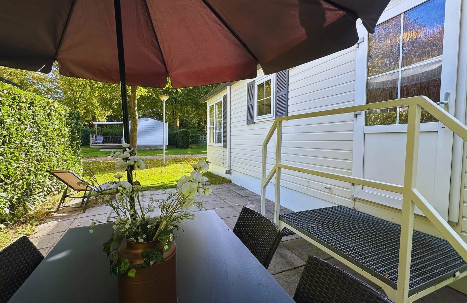 Chalet Typ D für 4 Personen ist gemütlich und hat ein schönes Licht wegen der großen Fenster. Auf der großzügigen Terrasse können Sie die Sonne und den Blick ins Grüne genießen.