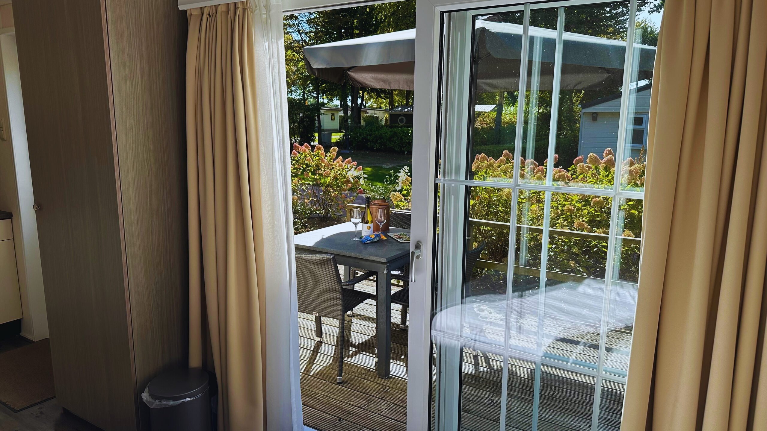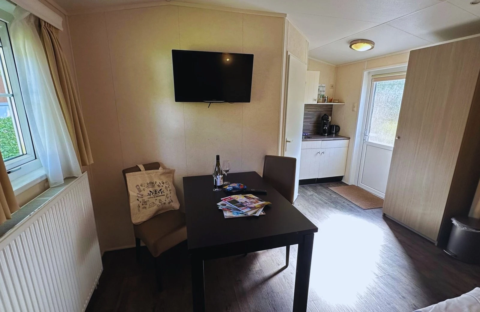 Sie können im Chalet oder auf der Veranda frühstücken. Ein Kühlschrank ist vorhanden. (Von April bis Oktober können Sie täglich frische Brötchen bestellen.)