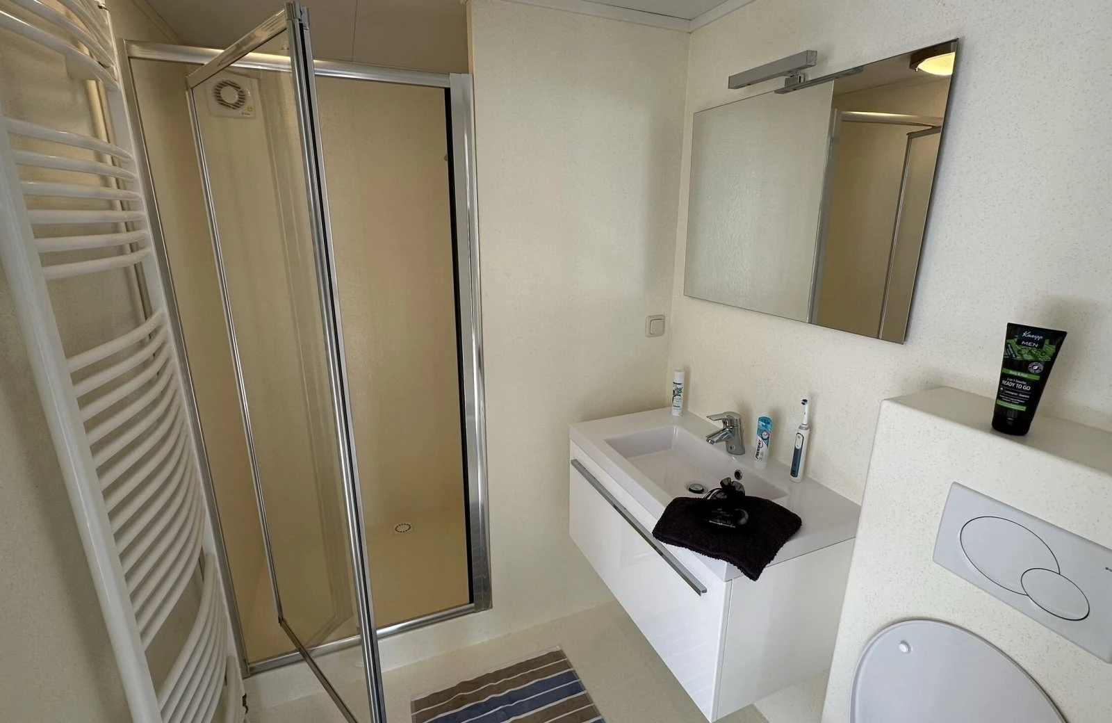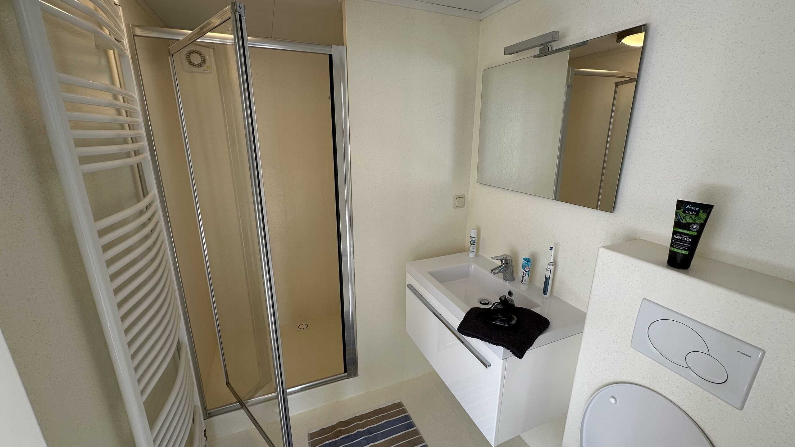 - Geräumiges Badezimmer mit Dusche, Toilette und luxuriösem Waschtisch
